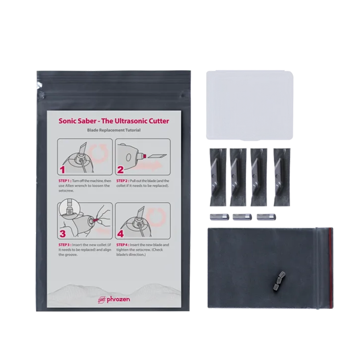 ชุดอุปกรณ์อะไหล่ของ Phrozen Sonic Saber ประกอบด้วย ใบมีด Sonic Saber ปลอกรัดใบมีด (Collets) อลูมิเนียม และสกรูยึด (Setscrews)